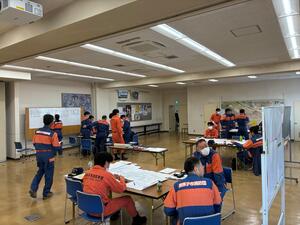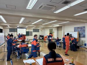 この訓練では、線状降水帯が発生し大雨による災害が多発したことを想定し、消防団員の参集から管轄地域内での情報収集訓練と並行し、消防団本部を設置し参集状況や各分団からの情報を取りまとめる図上訓練を実施しました。