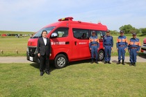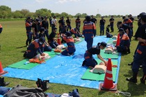 この訓練では、消防業務を実施するにあたり基本となる厳正な規律を身に付ける訓練や、ホース延長訓練、救急訓練などを行いました。また、新たに入団した消防団員への辞令交付式や消防団長による通常点検、総務省から貸与された消防団車両のお披露目などを行い、日々災害に立ち向かう消防団の士気向上に繋がりました