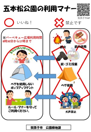 - 五本松公園では指定の範囲内でバーベキューが可能です。利用する場合は、注意事項をよく確認してご利用ください。予約等の手続きは不要です。