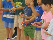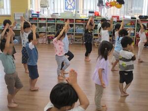 暑かった今年の夏は室内で体をたくさん動かしました。音楽に合わせて体を動かすリズム遊びやリトミックも子どもたちの大好きな活動の一つです。継続することでしなやかな体づくりにつながります。
