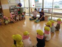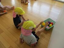 3歳児クラスの集団あそびの様子です。2チームに分かれて玉入れを楽しみました。今回は手を使わず足を使っての玉入れに挑戦。足で玉を挟むのはなかなか難しく、集中して取り組む様子がとてもほほえましかったです。また、爆弾ゲームも楽しんでいます。爆弾ゲームは、音楽が鳴っている間は、爆弾を回していき、音楽が止まった時に爆弾を持っていた子はちょっとした罰ゲーム(動物の鳴きまねなど)をするという少しスリルを楽しむゲームです。集団あそびを通して勝敗がつくおもしろさやルールを守って遊ぶ楽しさを学んでいます。