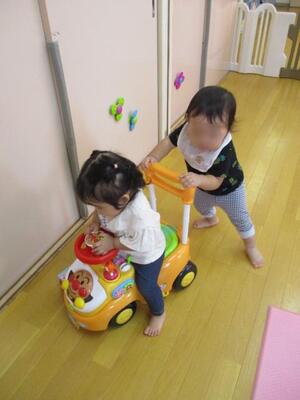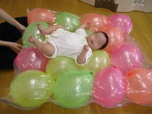 0歳児クラスの室内あそびの様子です。風船をたくさん入れた布団の圧縮袋はふわふわベッドに早変わり!ゴロンと横になったり、ゆらゆら揺らしてもらい、感覚を楽しんでいます。月齢の大きい子はコンビカーを押したり、漕いだりと足をたくさん使うことで歩行が安定してきます。