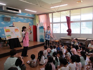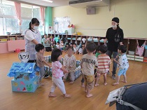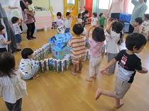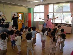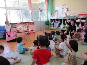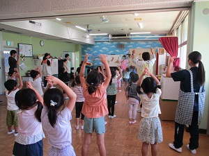 9月2日(火)、ヤクルトのおなか元気教室がありました。乳児組・幼児組それぞれ集まり、乳児組は「おなかのやくそく」の紙芝居を見てから「うんこでサンバ」を踊りました。幼児組はポンタくんや先生たちとおなかの約束を確認してから、同じくダンスを踊りました。全員分のヤクルトもいただき、給食の時間に飲んで大喜びの子どもたちでした。