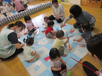 乳児組は、うさぎ組に集まり、「アンパンマン音頭」を踊ってから、順番におみこしにチャレンジしたり、コーナーあそびをしたりして過ごしました。