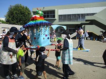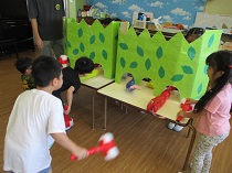 幼児組は、園庭でらいおん組のおみこしを手作りうちわを持って応援し、盆踊り「もったいないばあさん音頭」と「クワガタ音頭」をみんなで踊ってから入室。各部屋で様々なコーナーあそびを楽しみました。