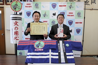 東日本ガス株式会社様より、火災予防の啓発のために、幼年消防クラブ用の法被と纏をご寄贈いただきました。ご寄贈いただいた法被と纏は、今後、消防出初式や各イベントなどの幼年消防クラブの活動で有効に活用していきます。星野市長から、ご寄贈への感謝の気持ちとして、感謝状を贈呈しました。