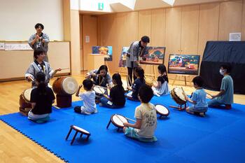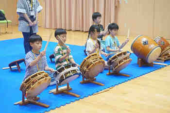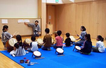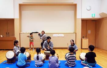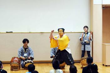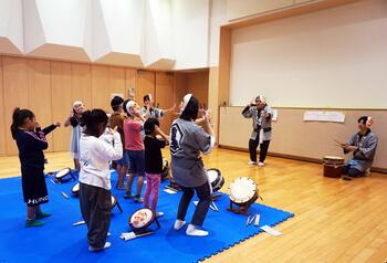 自由なリズムで太鼓を叩いてもらうリズム打ちの体験と、「仁羽」の文句『テケテン ツク ステスク テン ツクツ(締太鼓)』『ドーンドーン ドンドン(大太鼓)』にあわせて叩く練習行い、最後に笛と鐘に合わせて演奏しました。