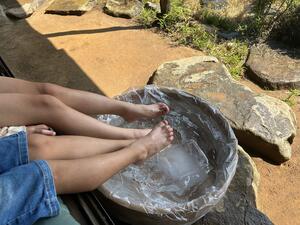 大きな氷を浮かべた氷水に足を浸して涼みました。
