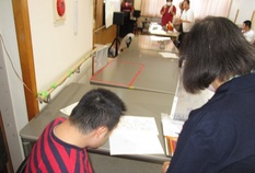 全体活動(食堂にて太鼓ゲームと塗り絵)