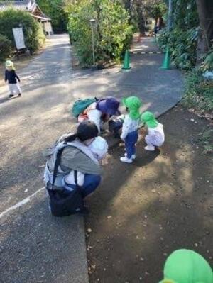 マイ保育園では地域の方に園の活動を知ってもらう機会です。今回は一歳児クラスと子の神大黒天にお散歩に行ってきました。途中、あおむしを育てているお宅の前で蝶々のさなぎを見てきました。大黒天では、どんぐりを夢中になって拾い集める子どもたちでした。