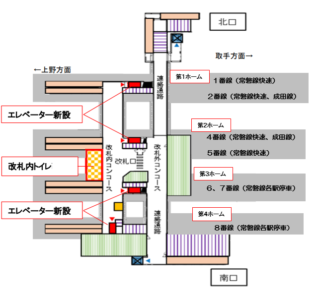 令和2年12月から工事を進めておりました、我孫子駅ホームエレベーター整備については、令和5年4月26日の6・7番線(常磐線各駅停車)ホームエレベーターの使用開始をもって、合計4基すべてが完成し、使用可能となりました。