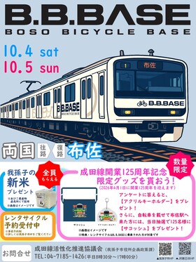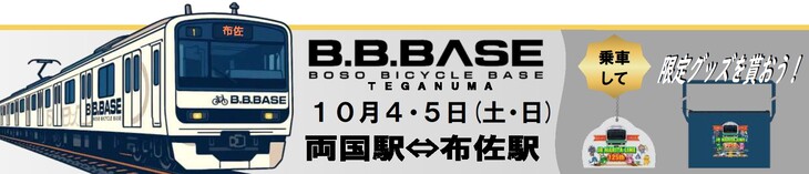 B.B.BASEとは、BOSO(房総)BICYCLE(自転車)BASE(基地)を意味し、電車そのものをサイクリングの「基地」にし、自転車を解体せずに電車に持ち込むことができます。2018年から運行しており、主に内房、外房、佐倉・銚子、佐原・鹿島、鹿野山・菜久留トレインの5コースで定期運行されています。