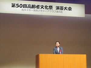 湖北台敬老お楽しみ会で挨拶する星野市長