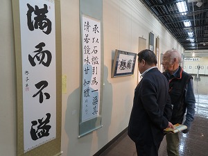 書道展では、漢字・かな・調和体作品や小学4年から中学3年生の作品が展示され、星野市長は、作品の説明を聴きながら、じっくりと鑑賞しました。