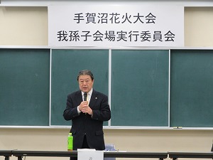 手賀沼花火大会実行委員会で挨拶する星野市長