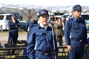 川村学園女子大学のグラウンドにおいて、総合防災訓練を実施しました。関係機関と連携した訓練の後、参加者に向け、星野市長は挨拶しました。