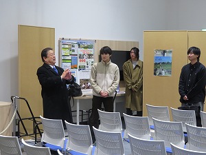 また、手賀沼ランタンに合わせて、水の館で、映画「ただいまと言える場所」の上映会が行われました。この映画は、市内2大学(川村学園女子大学・中央学院大学)の学生、高校生、社会人が、地元の活性化につなげるため我孫子市内を舞台に制作した作品です。星野市長は会場を訪れ、映画制作に関わった学生たちと交流しました。