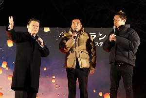 夕方には、天気も回復し、星野市長は、特別ゲストの我孫子市ふるさと大使ナイツの塙宣之さんと、お兄様でお笑いタレントのはなわさんのお二人と共にステージに登壇し、軽快なトークを繰り広げました。