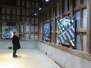 本城直季氏は、市内在住の写真家であり、『small planet』(リトルモア、2006年)で第32回木村伊兵衛写真賞を受賞されました。旧井上家住宅には、今回の展示のために市内各所で撮りおろした作品が蔵に展示されていました。また、母屋には、スライドショーの形式で鑑賞できるような工夫がされており、市長には、普段は見られない空から撮影した市内の様子をじっくりと鑑賞しました。