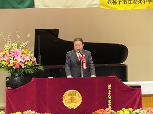湖北小学校卒業証書授与式で祝辞を述べる星野市長