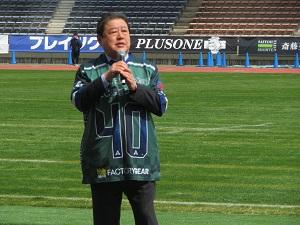 グラウンドから選手、観客にメッセージを贈る星野市長